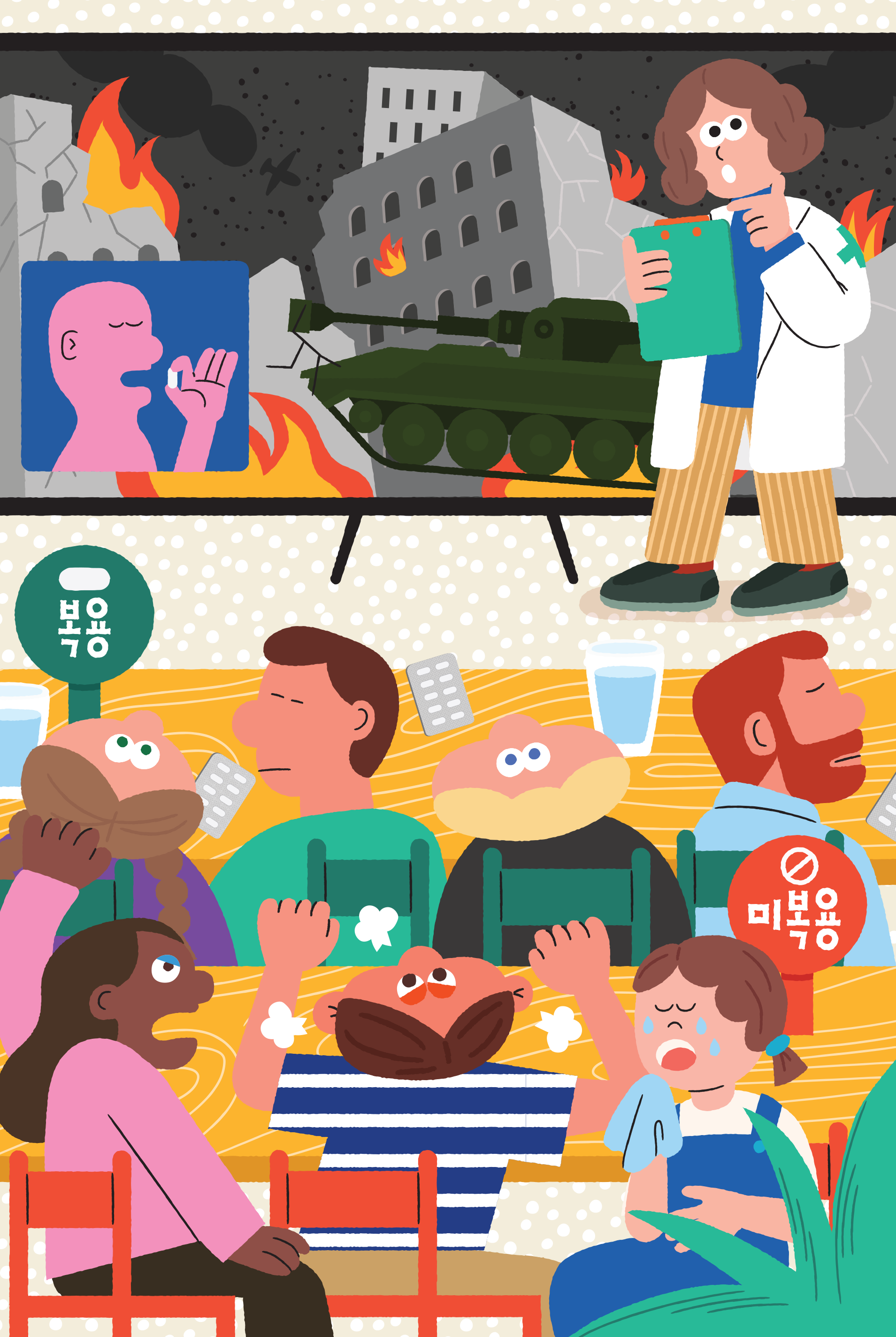 I created cheerful character illustrations to spark people's interest, and designed the pharmaceutical artwork to feel similar to stylized real products yet fun like miniature toys, conveying a friendly impression of medicines that might otherwise feel intimidating.